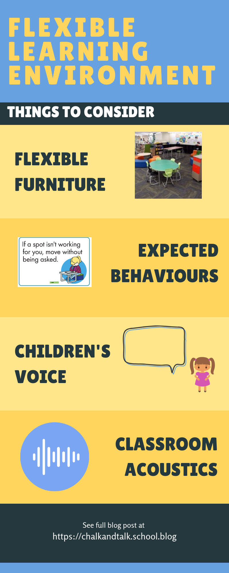 The different types of furniture and creating interactive spaces only becomes an effective and engaging environment when the children are explicitly taught about each space and the purpose for each area. I often refer back to the spaces when we transition from the carpet to our individual learning areas. The children are encouraged to make decisions about where they would learn best and if I see a seat or area that they have chosen but is not effective, the student and I will discuss why it might not be working and then provide other options for making another choice. The furniture is from Furnware and I found some visual displays to support the children’s understanding of different areas and making those decisions from Teach Starter.