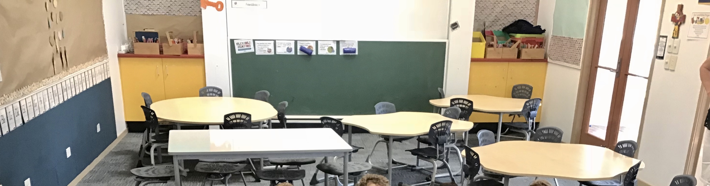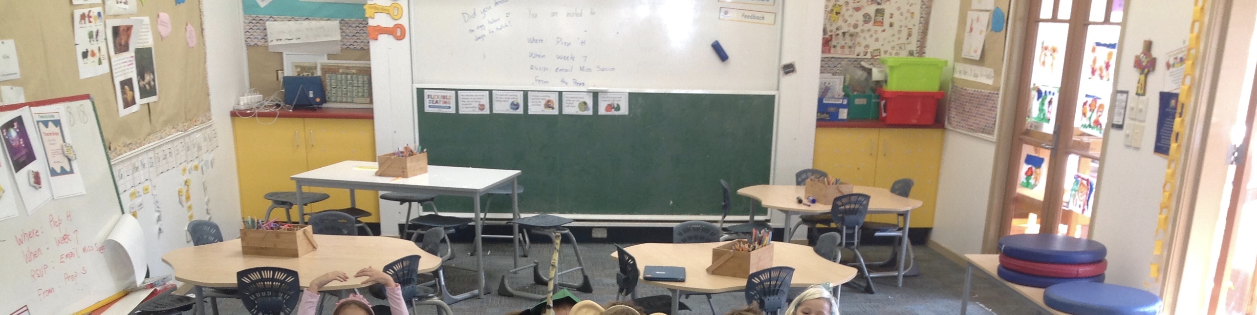 Some examples of the furniture and arrangements. The visual reminders about flexible seating are on the blackboard at children’s eye level. Just a slight rearrangement to cater for different learning purposes.